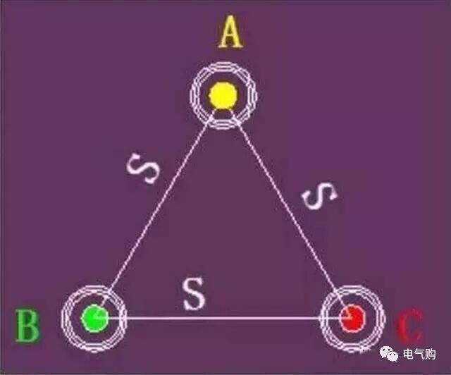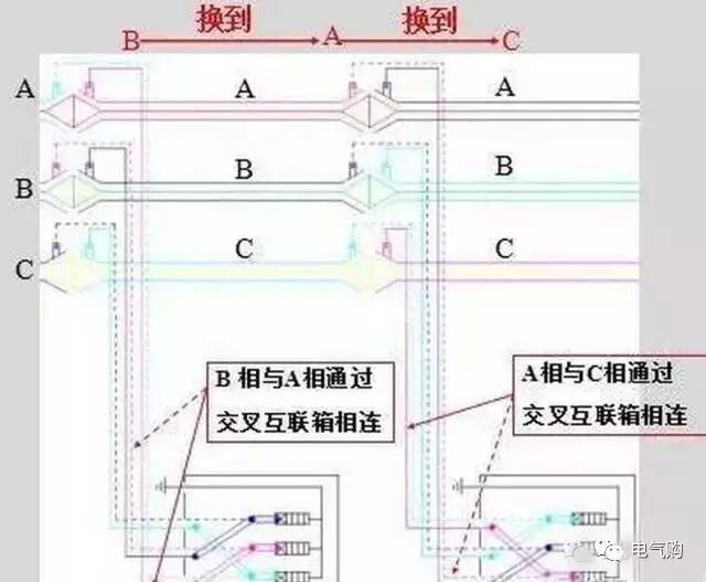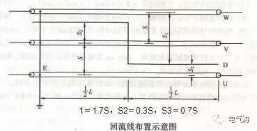 回流线选用150-400mm2铜芯塑料绝缘线。回流线应敷设在边相和中相之间,并在线路中点换位,如下图所示。